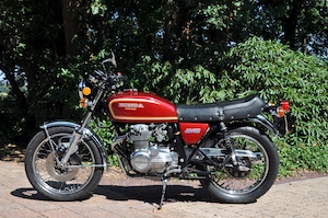 The F0 was offered in 1975 and 1976 and featured a solid color tank and side-panels in Light Ruby Red or Varnish Blue. The tank logo featured a large “Honda” with a smaller “Super Sport” logo underneath. The side-cover logo read “400 Four” in a distint double-line font. In 1976, after frame number 1056883, the passenger footpegs were moved from a swing-arm mount to a loop bracket welded to the frame.