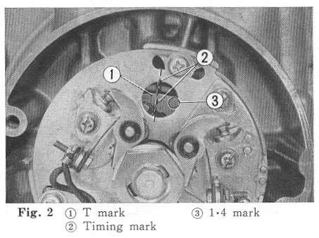 Remove the point cover and align the “T” (1.4) mark on the spark advancer to the timing mark (Fig. 2)
