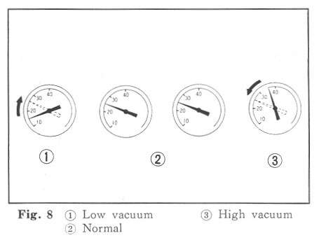 Valve tappet clearances INLET 0.05 mm (0. 002 in.) EXHAUST 0.08 mm (0. 003 in.) Next, rotate the crankshaft one revolution and realign the “T” (1.4) mark on the spark advancer to the timing mark (Fig 2)(in this position, the No. 4 piston is at top-dead-center of the compression stroke). Then check and adjust the valve tappet clearances indicated by ” X ” in the chart below. See item #5 above for proper valve tappet clearances.