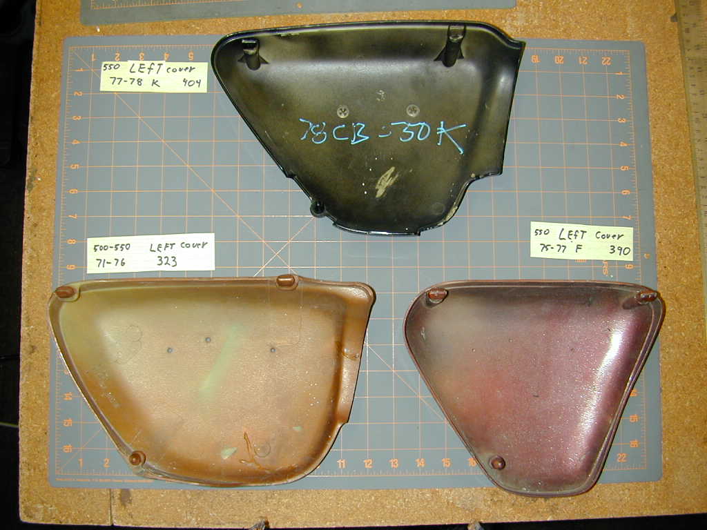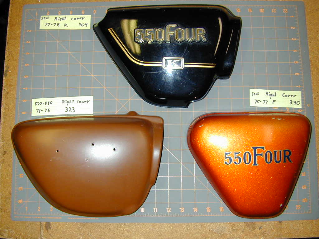 The left cover mountings are the same for all the 500-550s all years. Swap around as you chose. The right covers differ in mounting at the top forward mount position where the mount tab is rotated 90 degrees. The 390 and 404 covers swap among frames F style and late K model, but not with the earlier K model 323 frames/covers.