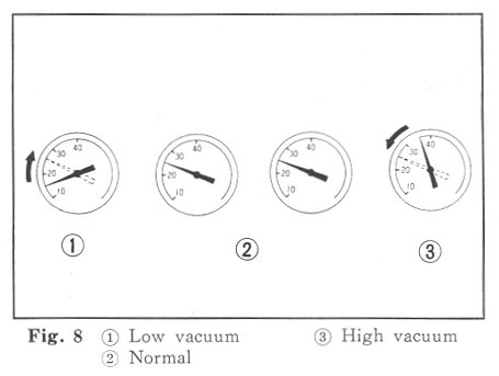 Valve tappet clearances INLET 0.05 mm (0. 002 in.) EXHAUST 0.08 mm (0. 003 in.) Next, rotate the crankshaft one revolution and realign the “T” (1.4) mark on the spark advancer to the timing mark (Fig 2)(in this position, the No. 4 piston is at top-dead-center of the compression stroke). Then check and adjust the valve tappet clearances indicated by ” X ” in the chart below. See item #5 above for proper valve tappet clearances.