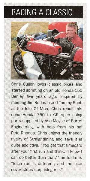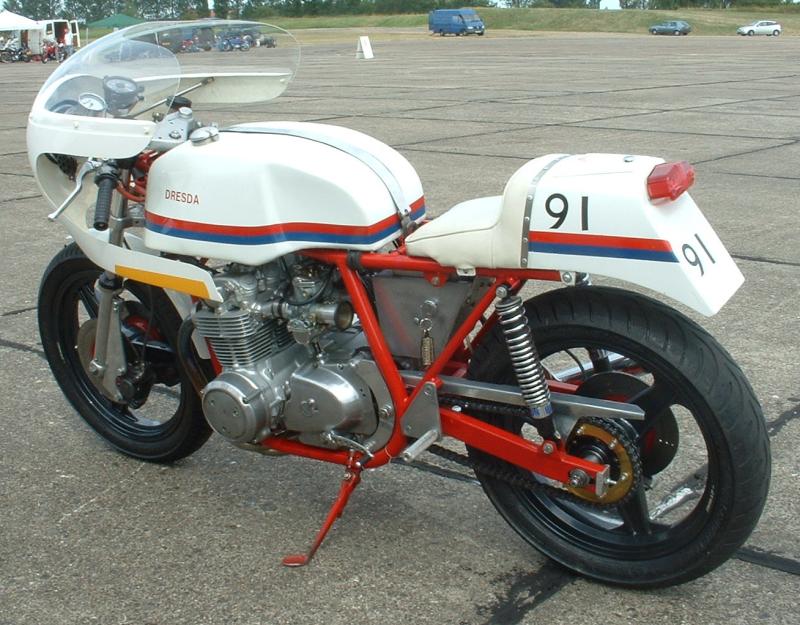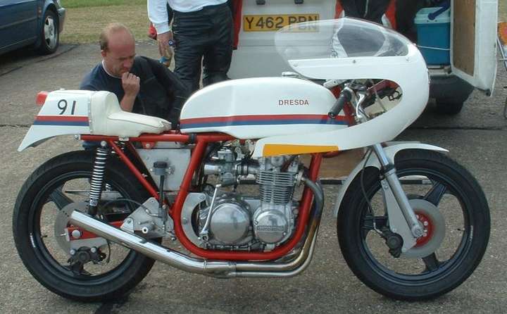 North weald (UK) Classic Bike Drag Meet 17th July 2006 Spotted this excellent Dresda at the North Weald Classic Bike Show on Sunday. Spoke to the owner who has had it since 1986. It’s an early Dresda frame (numbered in the high 100′s) with a K2 500/4 engine (CB500E-21xxxxx), Alpha exhaust, Dymag wheels and Lockheed brakes. Some serious engineering by the owner. His 1/4 mile drag times were not so good due to a bit of bogging at take off so he didn’t bother recording them. Maybe next time…