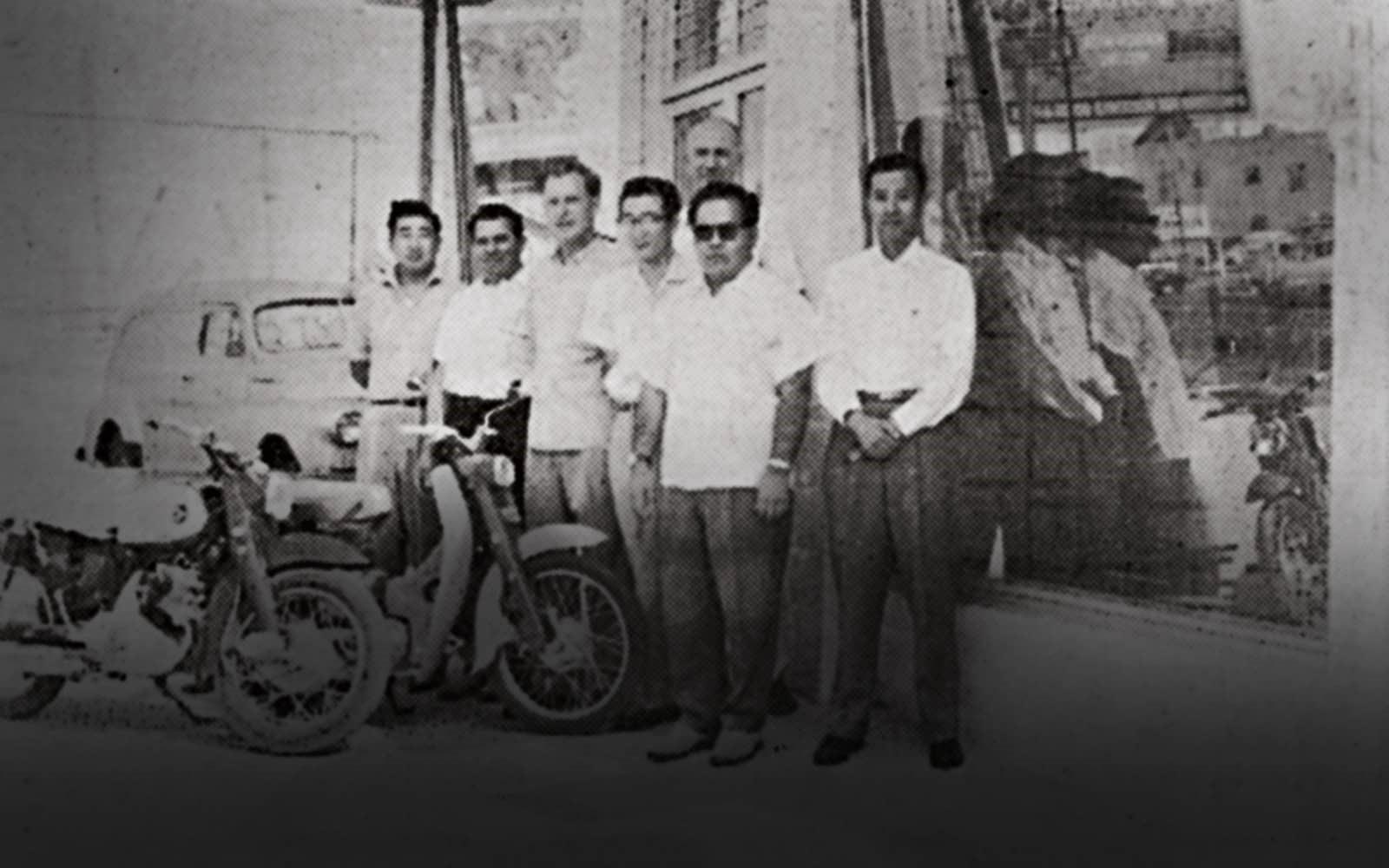 Soichiro Honda (left), founder of Honda Motor Co., Ltd. and co-founder Takeo Fujisawa (right), shortly after announcing their retirements as president and executive president, respectively. The pair led Honda from a start-up motorcycle company into a global enterprise focused on multiple forms of mobility, including the best-selling vehicle in the world (Super Cub).