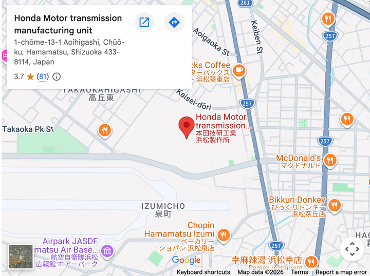 The Hamamatsu plant opened in 1954. From 1968 until 1971, the CB750 bodies were made here. After 1971, production demands led Honda to consolidate CB750 engine and body production at the Suzuka Factory. Present-day production focuses on automatic transmissions since motorcycle manufacturing was moved to the Kumamoto Factory in 2006.13-1, Aoi-Higashi 1 -chrome, Hamamatsu-shi, Shizuoka-ken 433, Japan
